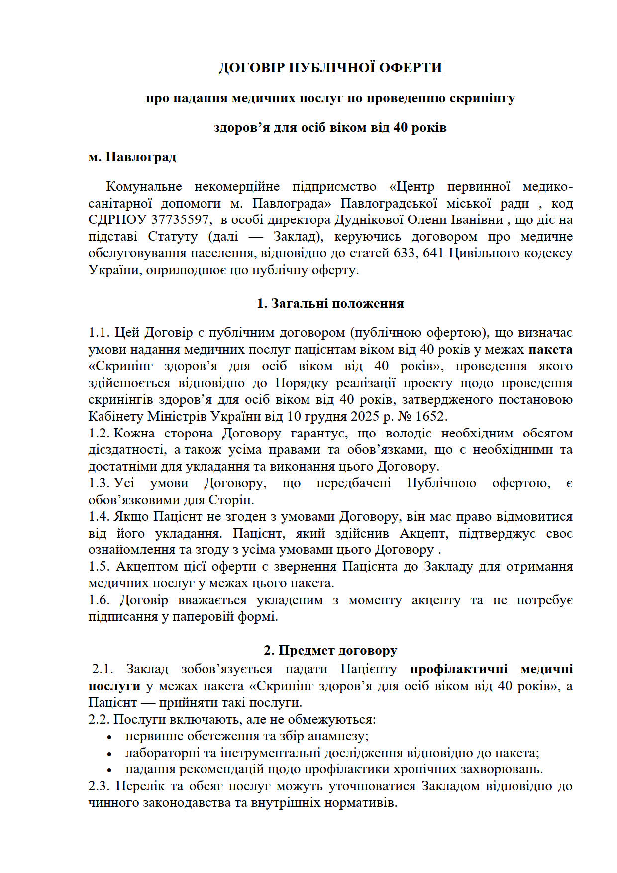 Як взяти участь?Громадяни віком 40+ отримують запрошення у застосунку Дія на 30-й день після дня народження.Після підтвердження оформлюється Дія.Картка, на яку держава нараховує 2000 грн для проходження скринінгу.Якщо ви не користуєтесь «Дією», можна оформити спеціальну картку в банку-партнері та звернутися до ЦНАП для подання заявки.Записатися можна:✔ за телефоном 066-90-36-717 (координатор Давиденко Ірина Володимирівна)Графік роботи:Пн.-вт.-пт.: 08.00-14.00Ср.: 07.00-13.00Чт.: 13.00-19.00Сб: 08.00-12.00 (раз на місяць)
